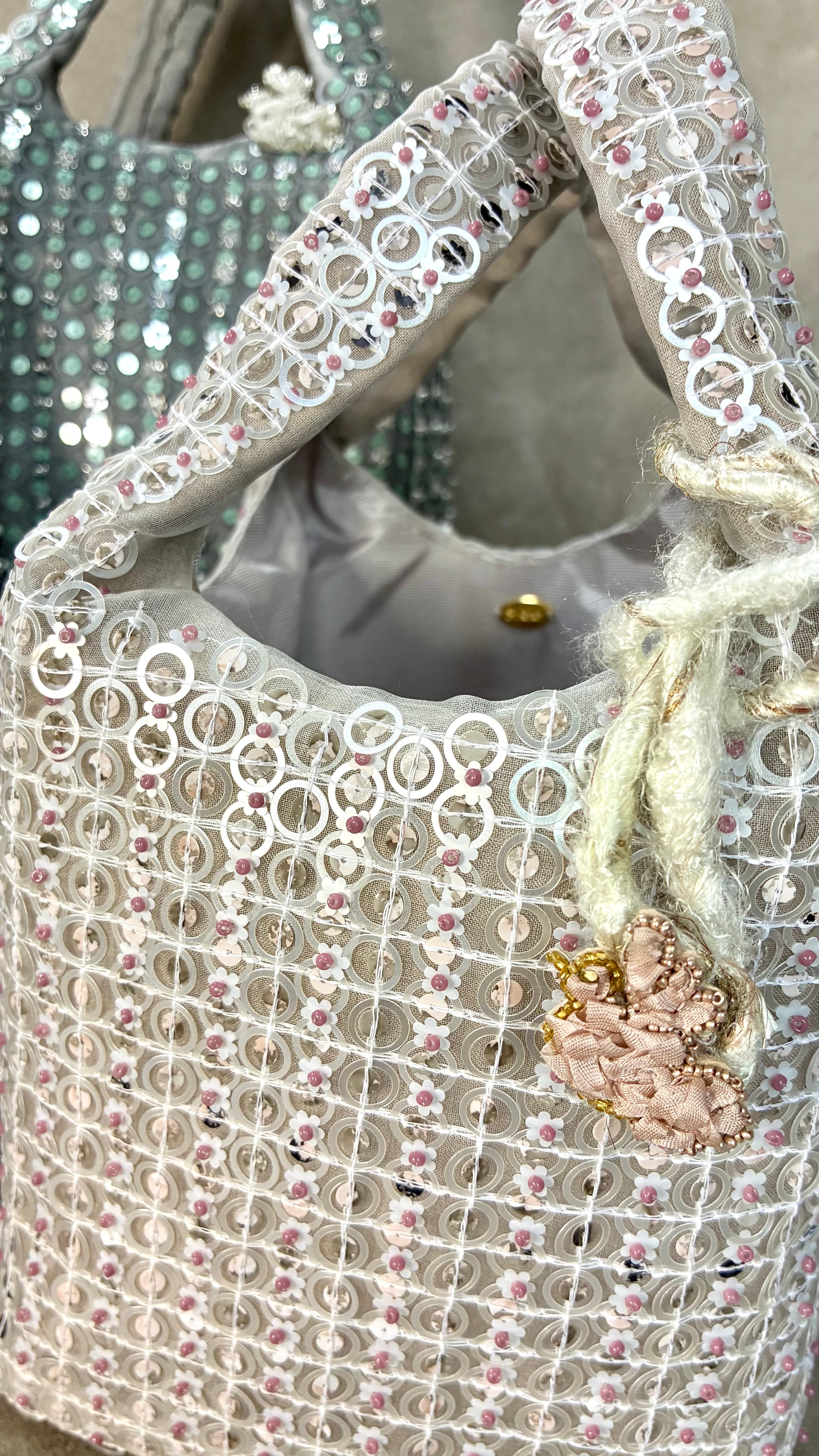 フェミニンで清楚、柔らかいイメージ。マーブル柄が珍しいスパンコールはベビーピンク×グレーをセレクト。真っ白なバッグではなく、グレージュのような落ち着いたカラーです。