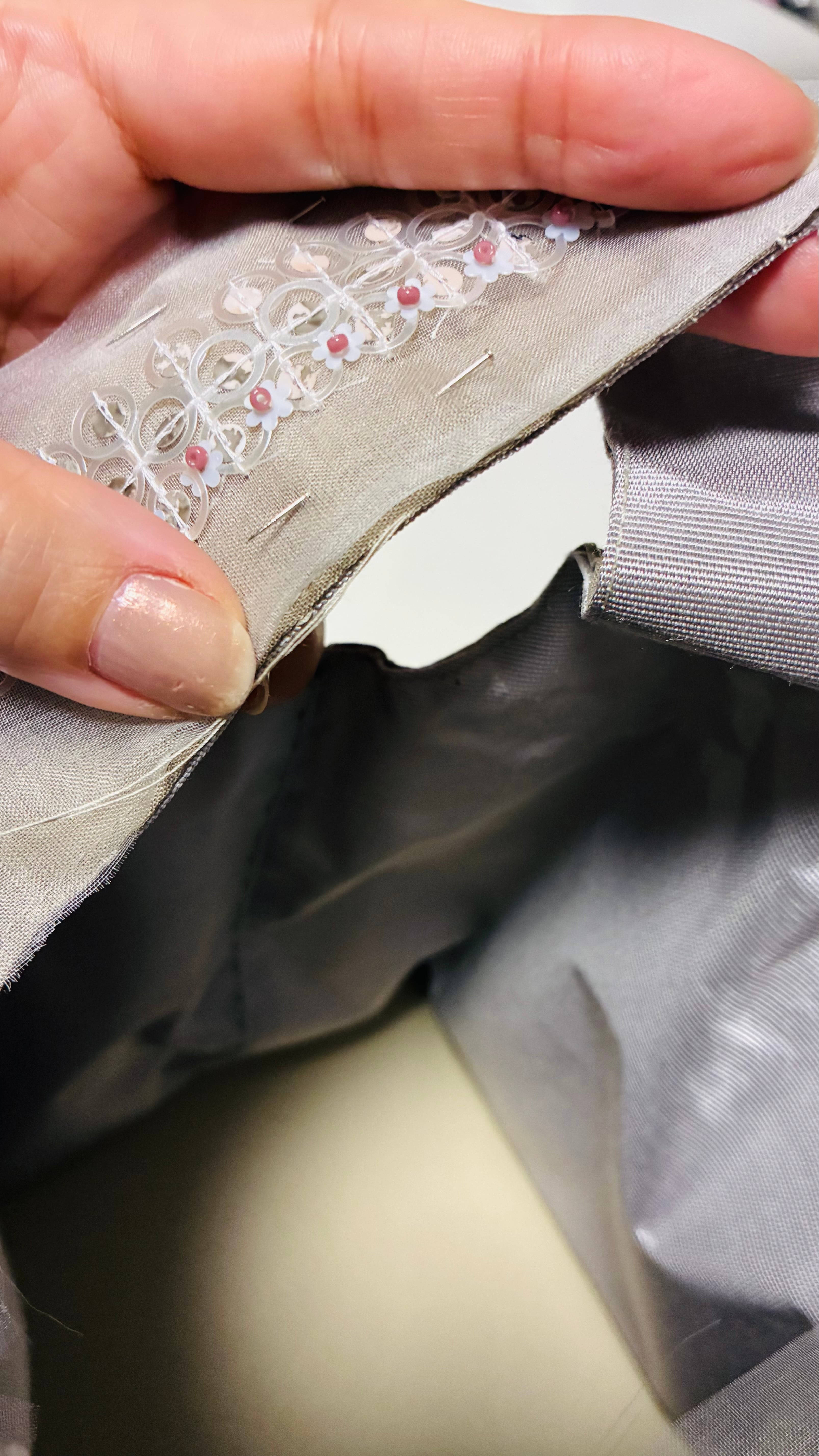【全面刺繍のバッグと小鳥のチャーム】の表裏両面の刺繍が完成しましたら、シレーヌのアトリエにて縫製を承ります。納期の目安は1ヶ月前後です。