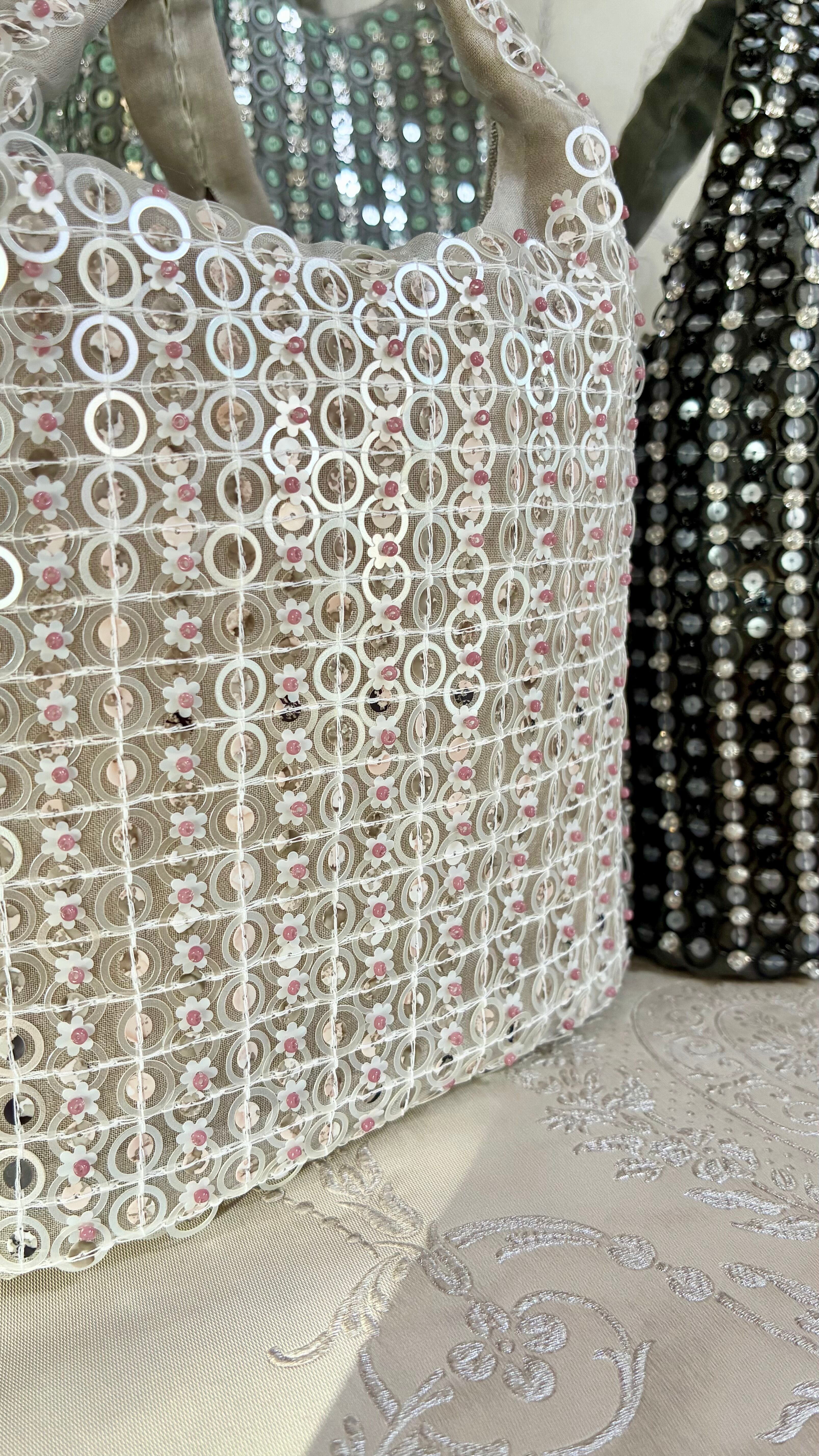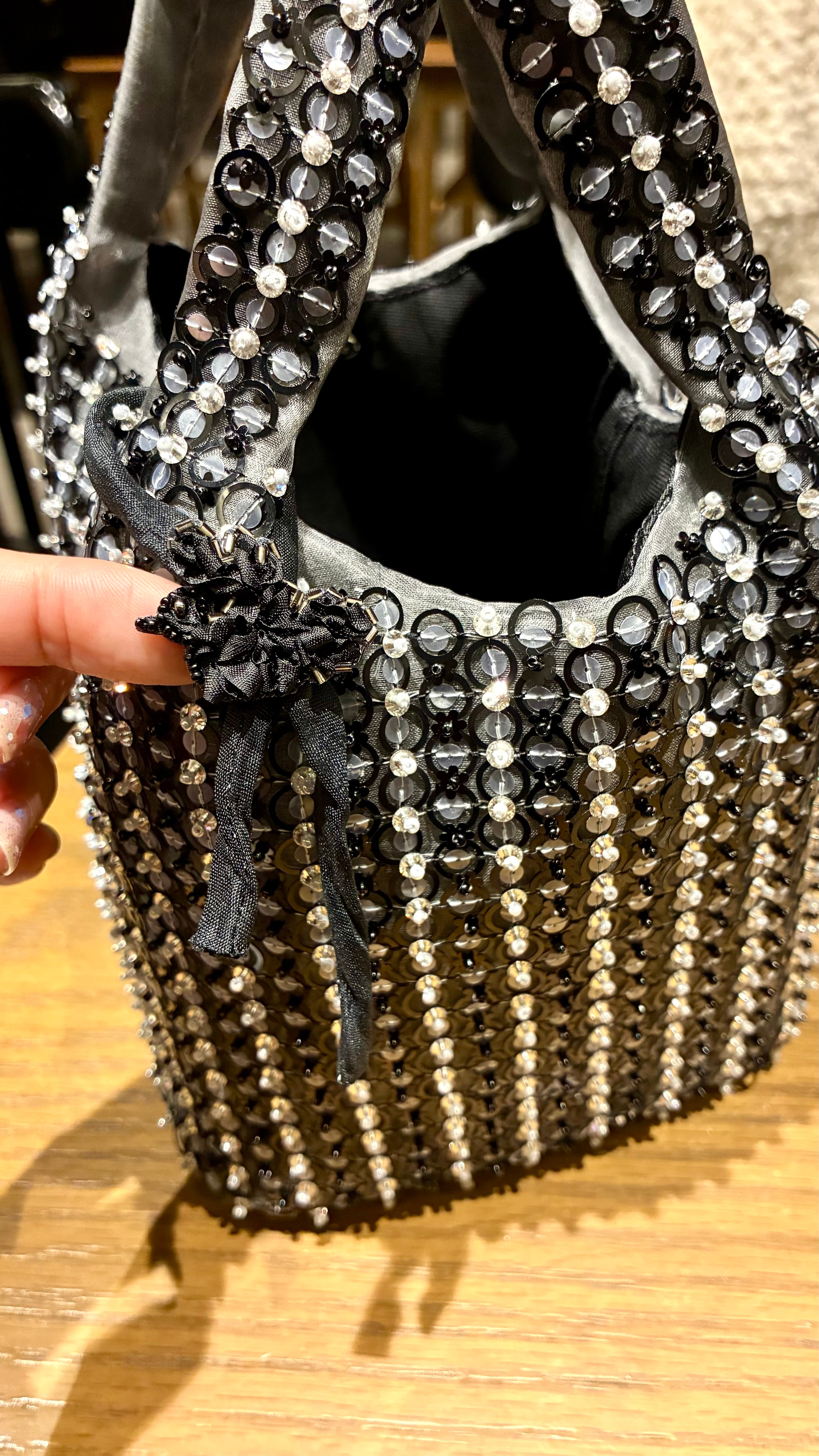 フェミニンで清楚、柔らかいイメージ。マーブル柄が珍しいスパンコールはベビーピンク×グレーをセレクト。真っ白なバッグではなく、グレージュのような落ち着いたカラーです。