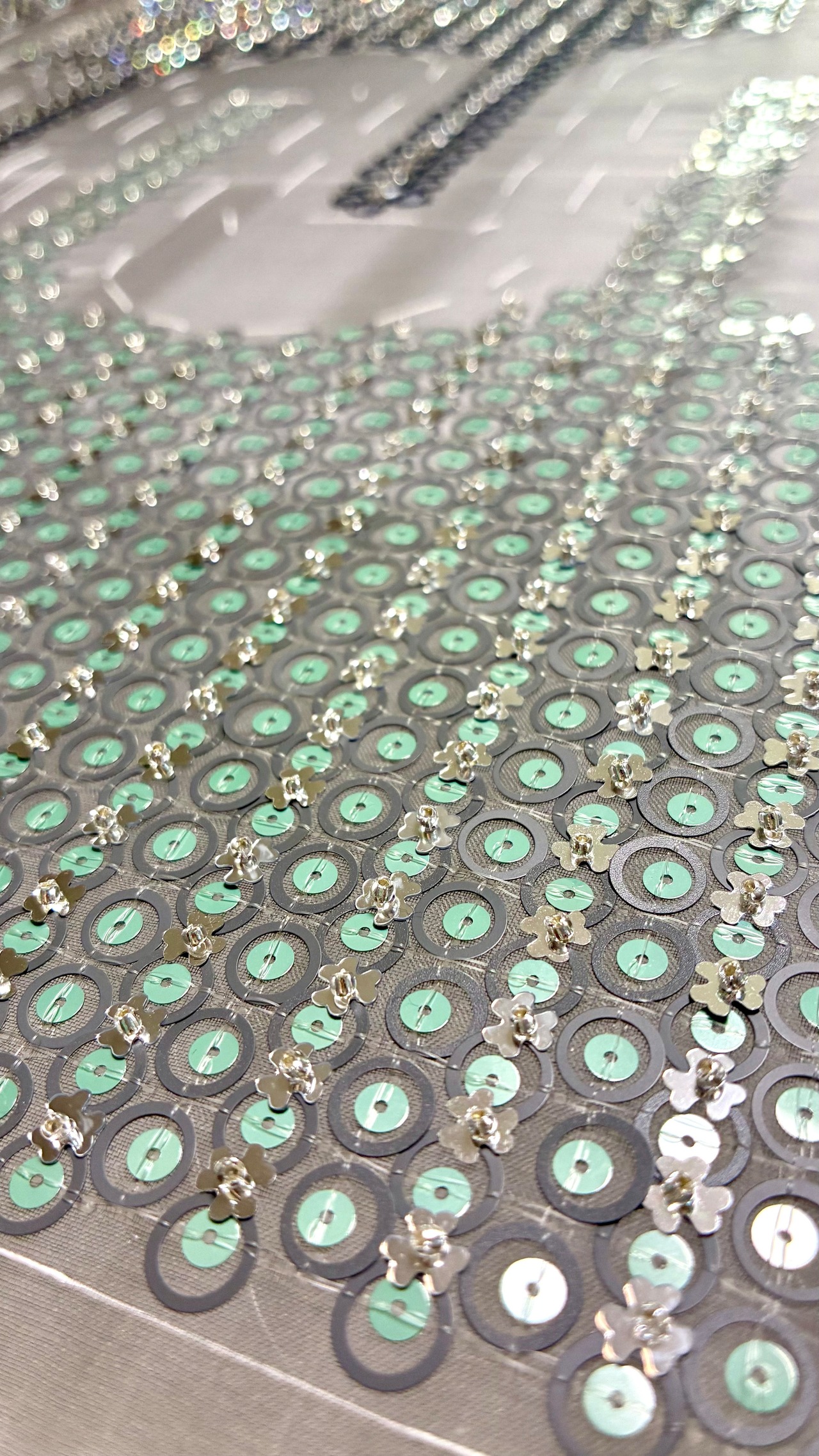 ✔︎ミントグリーン×シルバー×グレーの組み合わせは意外とどんな色のお召し物とも合わせやすく、花型スパンコールがキラッと華やかに輝きます。