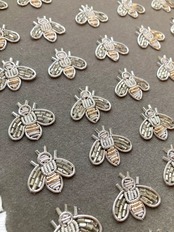 裏面の本革はシレーヌでデザインし、シャンパンゴールドの箔がけをした華やかなオリジナルです。ミツバチのブローチはシレーヌ商品の中で最軽量なので、ストール・バッグ・ポーチに付けたり、花モチーフのブローチと重ね付けしたり様々なシーンでお使い頂けると思います。
