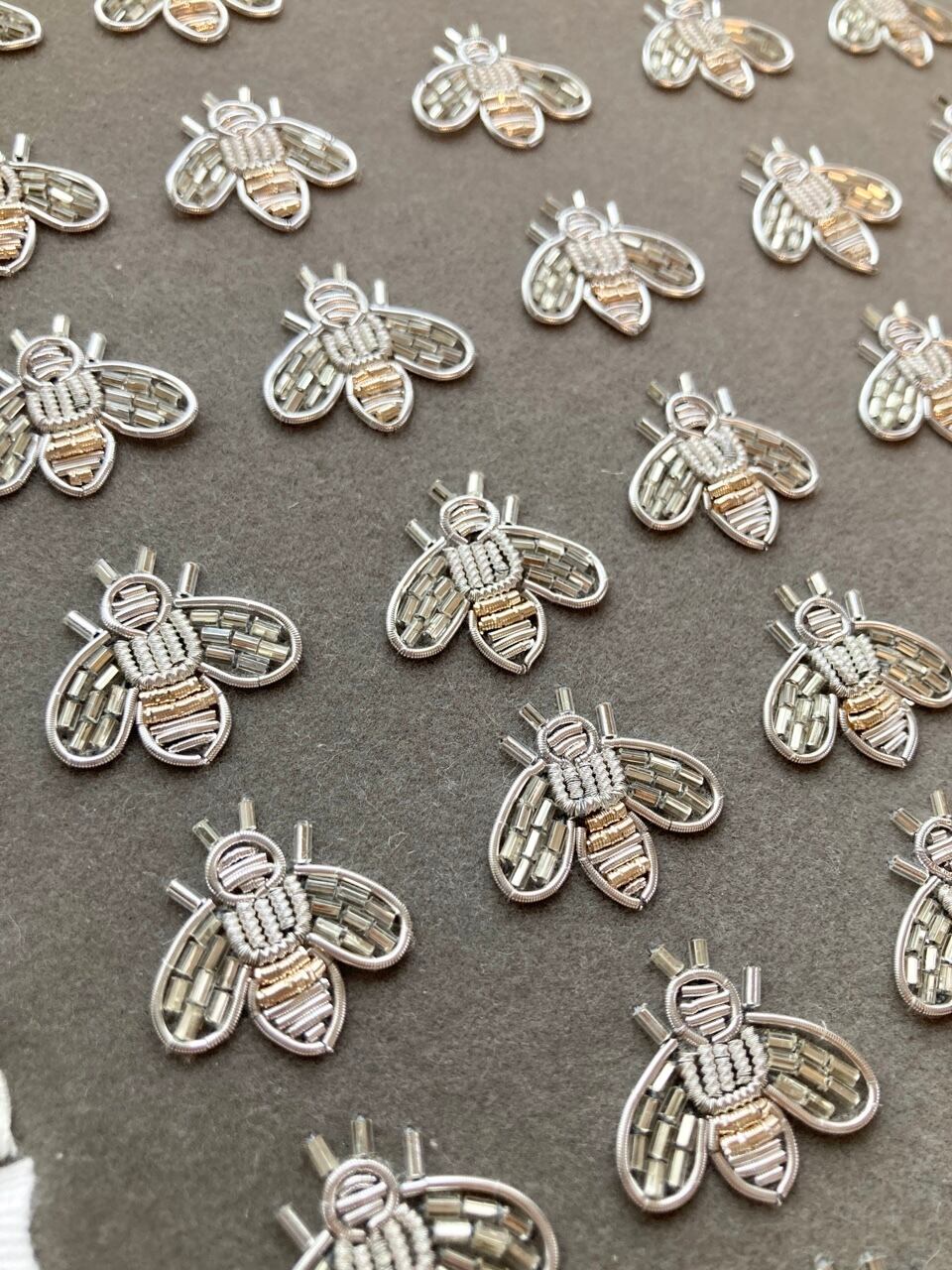 シルバーとシャンパンゴールド、3種類のワイヤーで蜂の愛らしさを細かく表現し、アンティークビーズでキラメキもプラスしました。